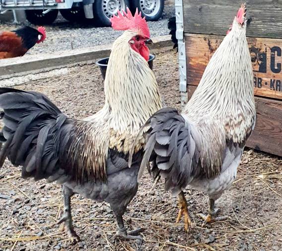 Silveruddsblå tuppar av avelskvalite. Finns i blå (grå) och svart. Alla med ljusare man. Vi har även en tupp tilsalu med gul rygg. Från 100 kr och upp till 200 kr för de största och stiligaste exemplaren.