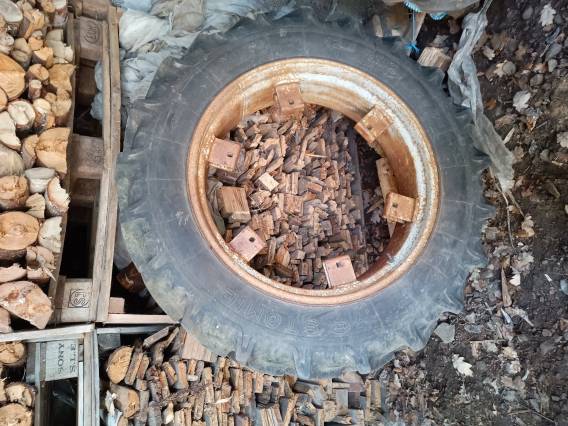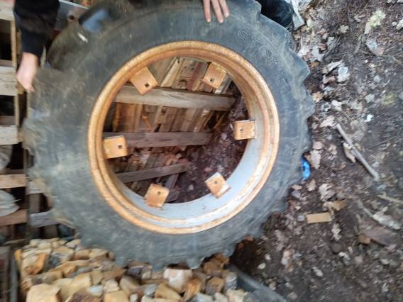 Två däck med fälg, dimension 12,4 r32. Märke Stomil.