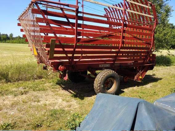 | Krone självlastarvagn som förvarats i loge. Nyligen provkörd och fungerande utan anmärkning. Lämplig för nystartat mindre jordbruk.
