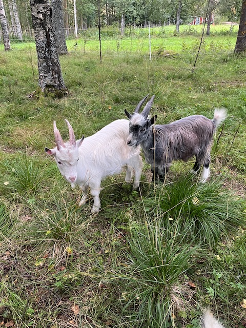 Vana vid hantering, går fint på elstängsel, går i koppel och skulle kunna tränas att dra lättare kälke/pulka. Eminenta slyröjare och riktiga tjejtjusare för avel. Genbank. Finns i Piteå.