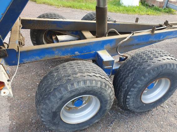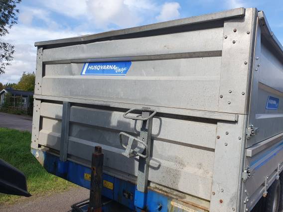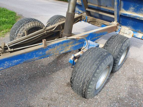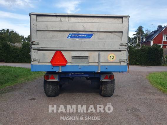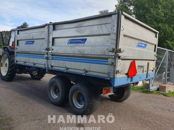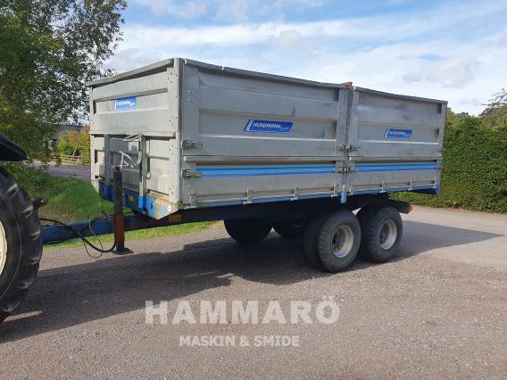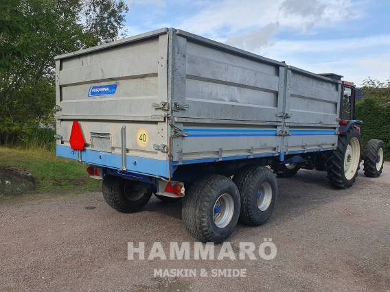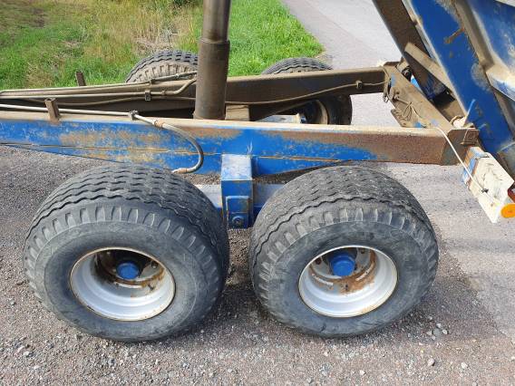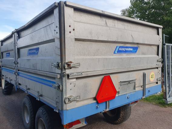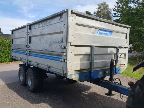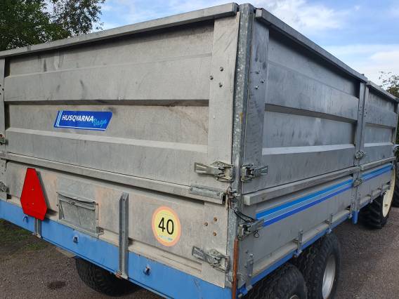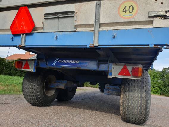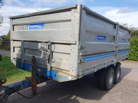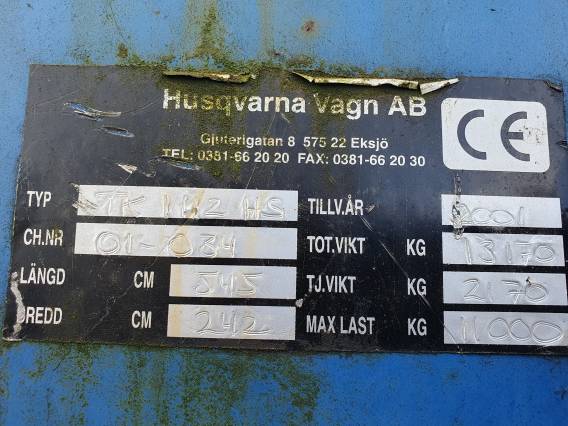 Beg spannmålskärra Husqvarna Vagnen TK 1112. Årsmodell -01. Totalvikt 13170 kg. Max last 11000 kg. Aluzink lämmar. Bromsad. Belysning. Stödben. Mittbåge för pressening. Däck 400/60-15.5.