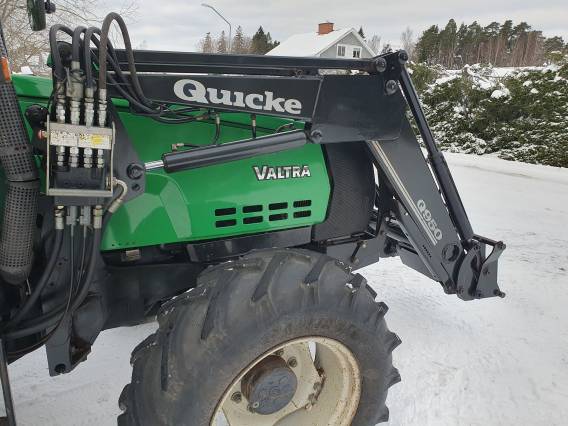 | ( SÅLD ) Beg traktor Valtra 6250 HighTech. Årsmodell -01. Ca 7503 tim. Kopplingsfri fram & back. Hitchkrok. Vändbar stol. Bakrute torkare. Arbetslampor fram & bak. Frontlastare Ålö Quicke Q950. Euro fäste. Tredje funktion. Nya däck fram & bak. Fint skick!