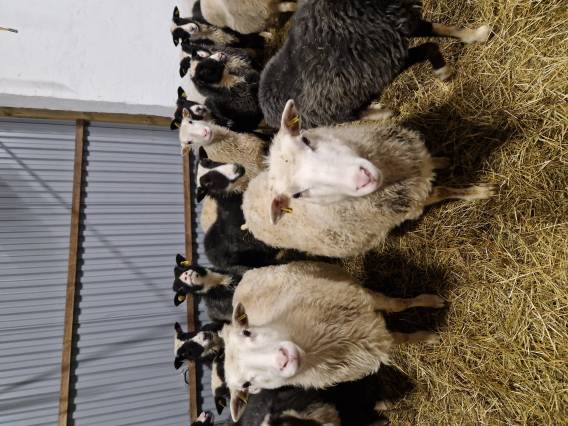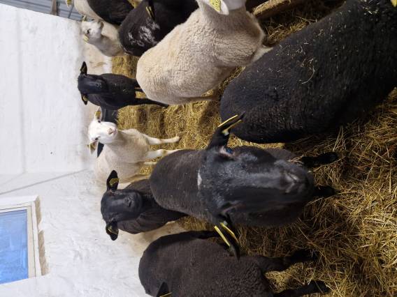 Köttraslamm blandat dorper/suffolk/texel. Klövsjöfår av blandade åldrar, genbank. Invallade. Klippta i höstas. MV3.